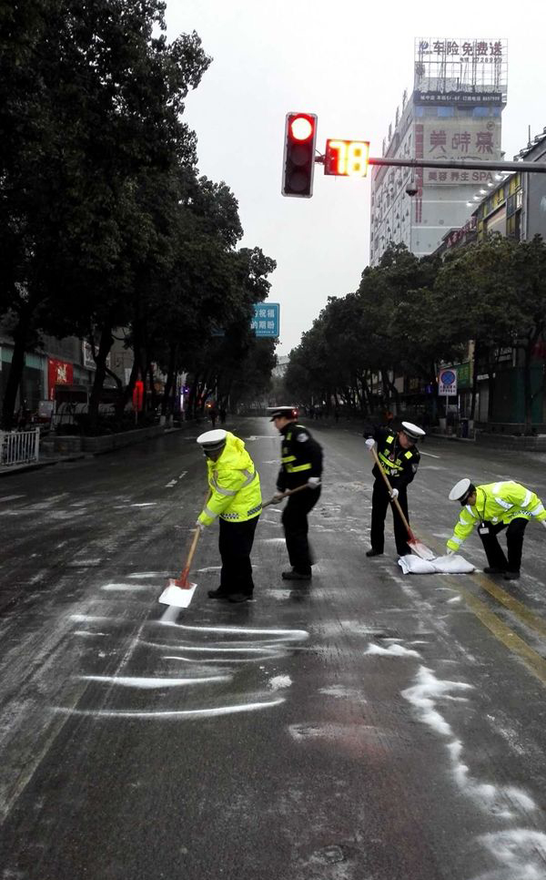 一、農(nóng)村: G209國道全線結(jié)冰,于1月26日晚18時對客運(yùn)車輛及7座以上車輛禁止通行,7座以下車輛必須安裝防滑鏈才能通行。因道路結(jié)冰,單方一般事故多發(fā),民警迅速出警,及時處置,并妥善安置事故當(dāng)事人;黃金坳座巖上坡因冰雪路滑,滯留車輛較多,民警協(xié)助駕駛?cè)税惭b防滑鏈,撒鹽除雪,幫助群眾。