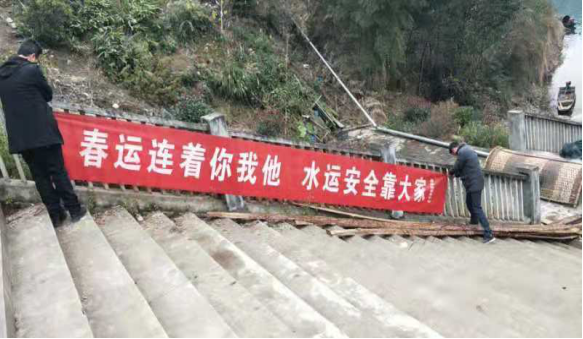 圖13 芷江縣水運(yùn)事務(wù)中心工作人員在重點(diǎn)渡口碼頭顯要位置處懸掛春運(yùn)安全橫幅